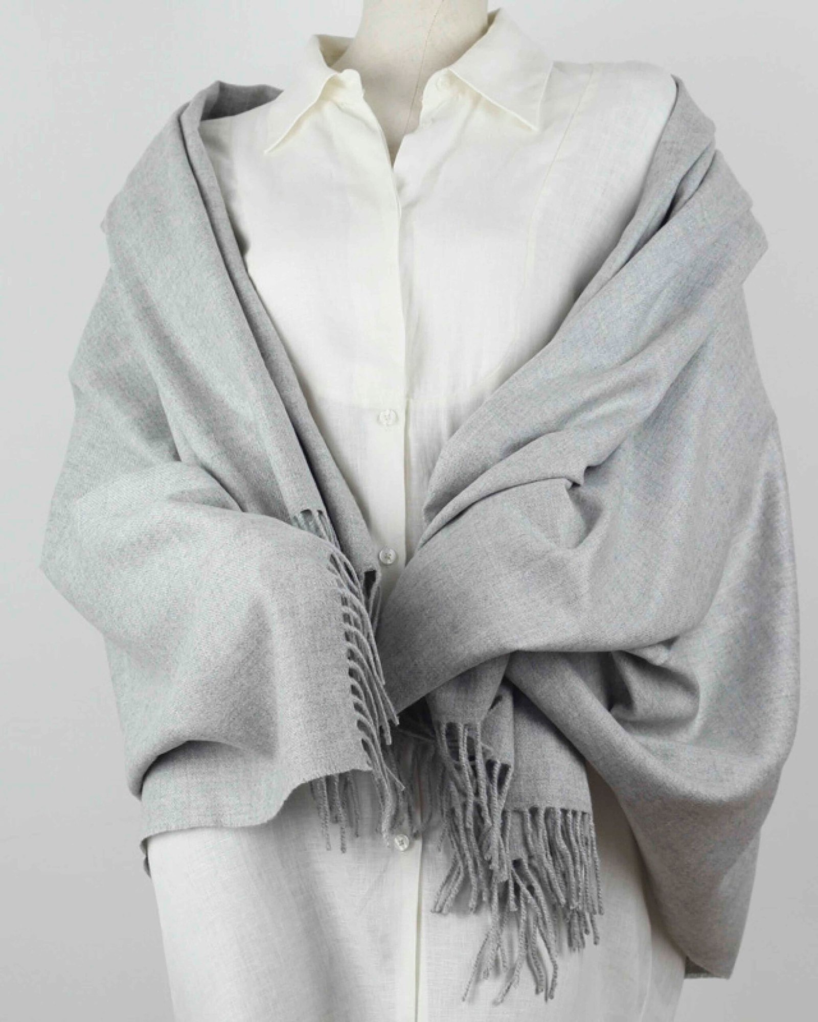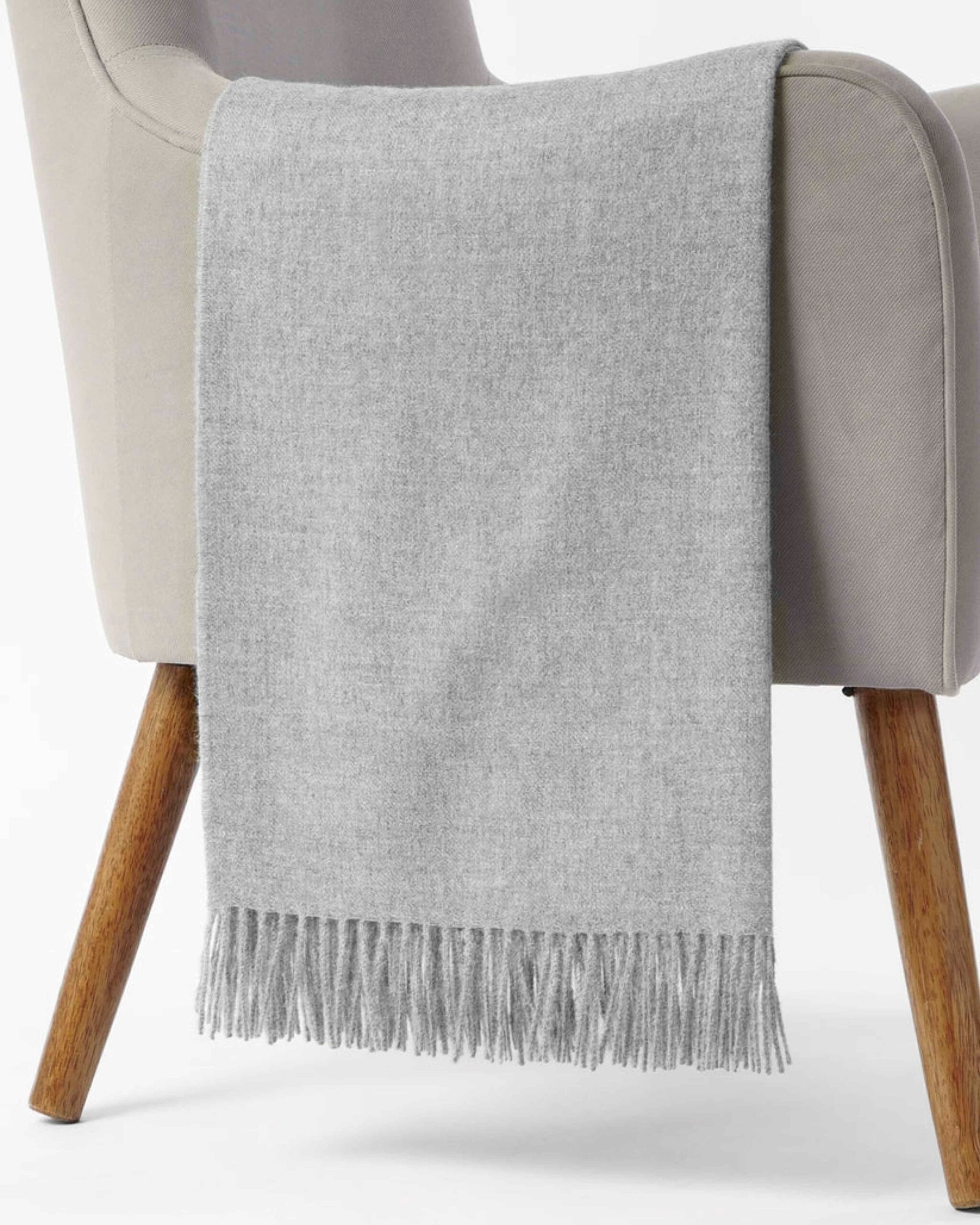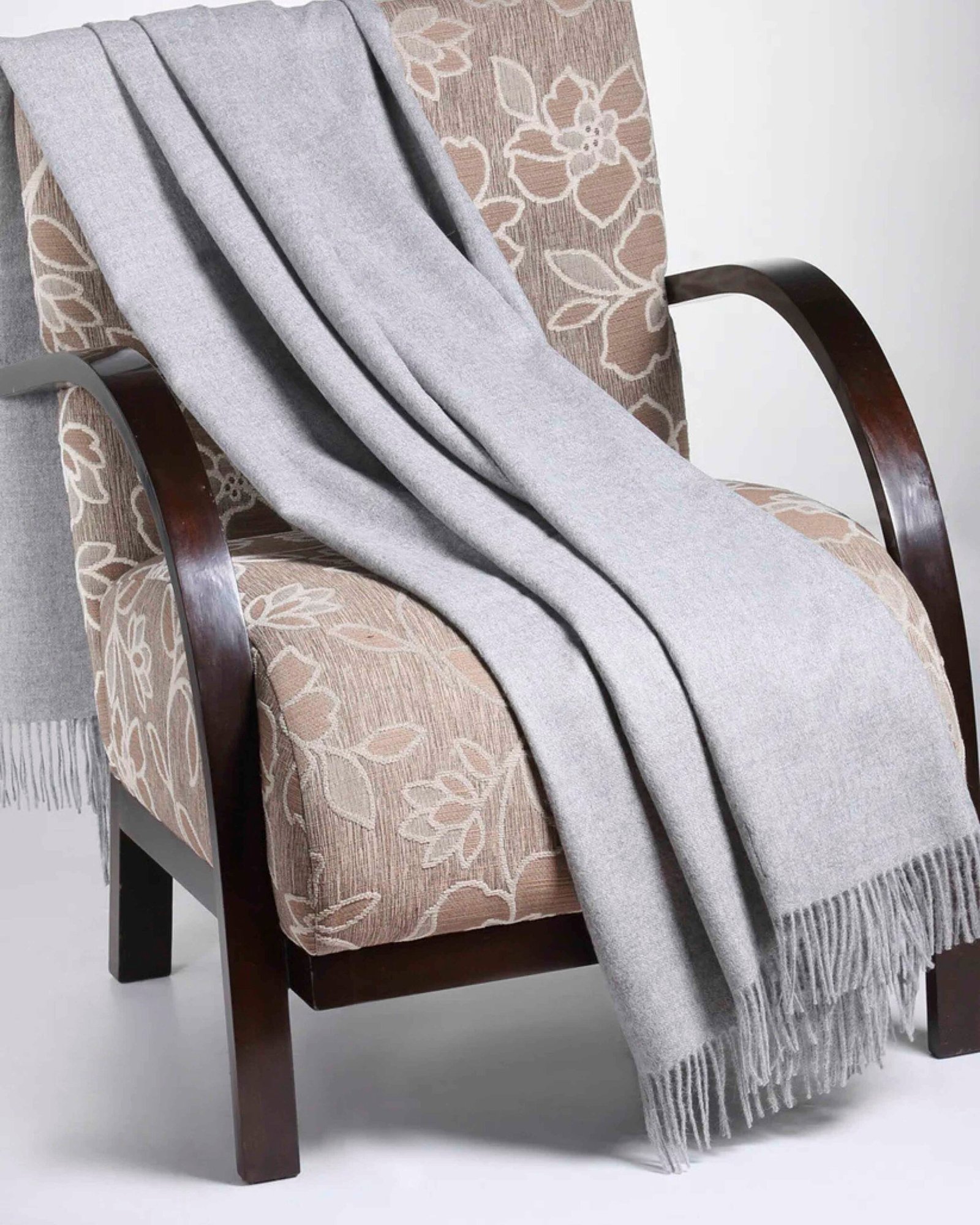 Exquisite blanket made of light gray baby alpaca, with a classic flat-weave design. This elegant accessory not only provides an exceptionally soft and warm feel for your moments of comfort at home, but also adds a touch of distinction and sophistication to your home decor, thanks to its unmatched elegance and style.