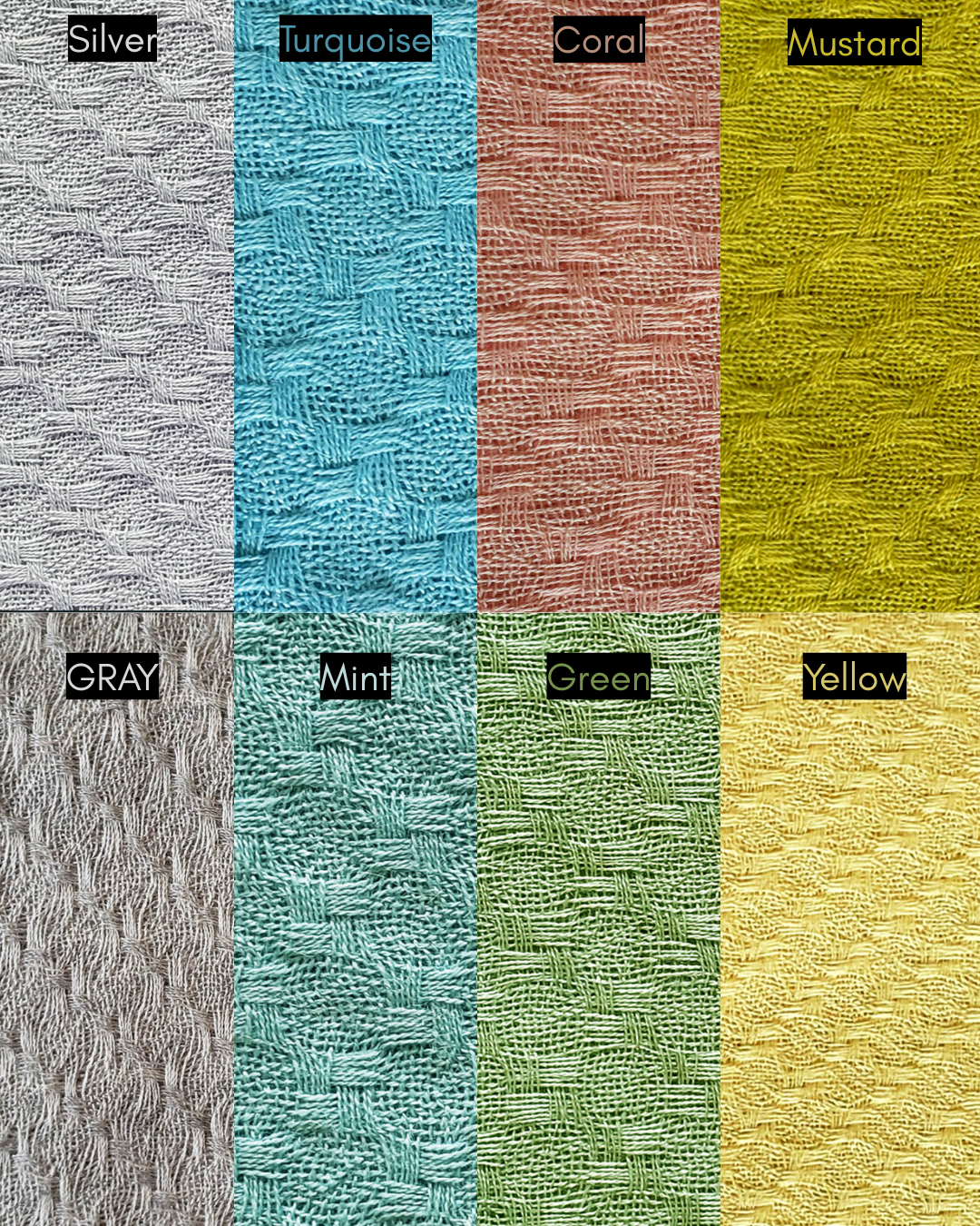 Beige, Brown, Coral, Gray, Green, Mint, Mustard, Navy Blue, Silver, Turquoise, White, Yellow